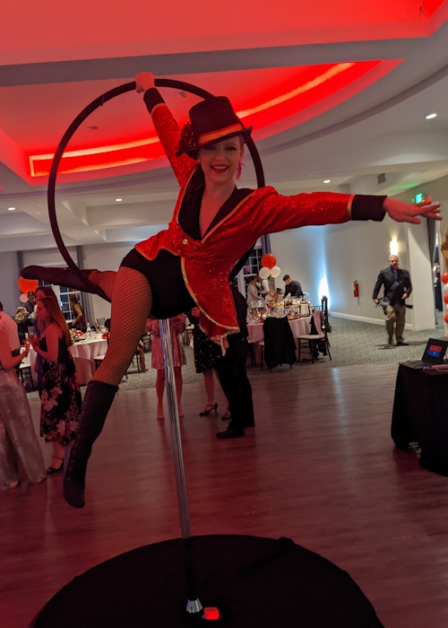 Aerial dancers add a high-flying wow-factor to any party. With portable apparatus of varying sizes, aerialists can add to a magical atmosphere in any event space. They perform on a variety of apparatus creating beautiful shapes with effortlessly fluid movement.
